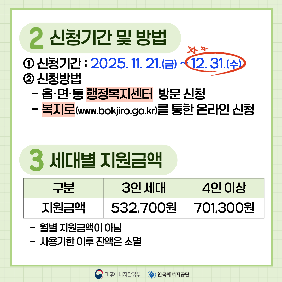지원 대상은 생계·의료·주거급여 또는 교육급여 수급자 중 에너지 취약계층으로 규정되어 있고, 여기에 다자녀가구라면 가중 요인으로 금액이 더 늘어나는 방식이에요. 일반적으로 △영유아 △노인 △장애인 구성 여부가 중요한 기준이지만, 다자녀 자체만으로도 충분히 고려되는 혜택이라 신청을 꼭 해보셔야 합니다.