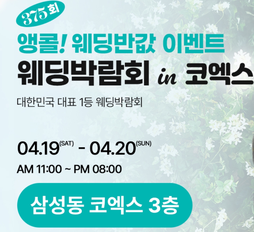 | 제375회 웨딩박람회 | 2025년 4월 19일(토) ~ 4월 20일(일) | 코엑스 3층 컨퍼런스룸(남) 317호~318호 |