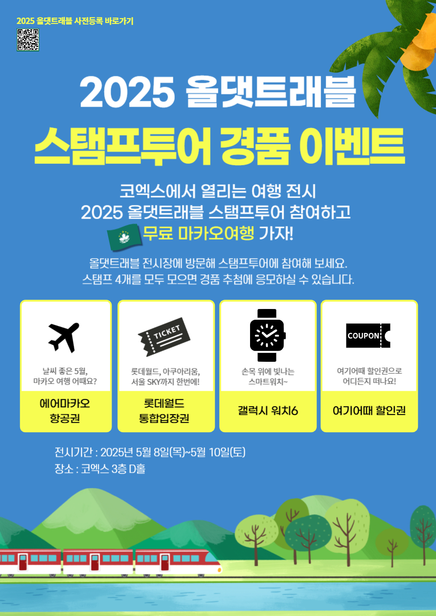 2025 올댓트래블페어는 5월 8일부터 10일까지 코엑스 D홀에서 개최되며, 200여 개 기업과 다양한 로컬 브랜드, 여행사, 혁신 스타트업이 참가합니다. B2B·B2C 통합 박람회로, 비즈니스 상담, 콘퍼런스, 여행상품 할인, 대규모 경품 이벤트 등 풍성한 프로그램이 준비되어 있습니다. 사전 등록 시 무료 입장이 가능하며, 최신 여행 트렌드와 로컬 콘텐츠, 관광산업의 미래를 한자리에서 경험할 수 있습니다.